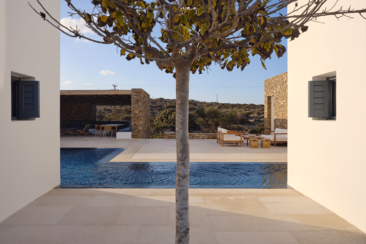 Στο εξωτερικό, η χρήση τοπικής πέτρας και ανόργανων επιχρισμάτων υψηλής αντοχής, ανθεκτικών στις παράκτιες συνθήκες και με ελάχιστες ανάγκες συντήρησης, καταδεικνύει μια επιμελημένη επιλογή υλικών με γνώμονα τη διάρκεια ζωής και τη σχετική βιωσιμότητα, όχι μόνο την αισθητική απόδοση: ένας παράγοντας που κρίνεται καθοριστικός στην καθημερινή εμπειρία και στο μακροχρόνιο περιβαλλοντικό αποτύπωμα.